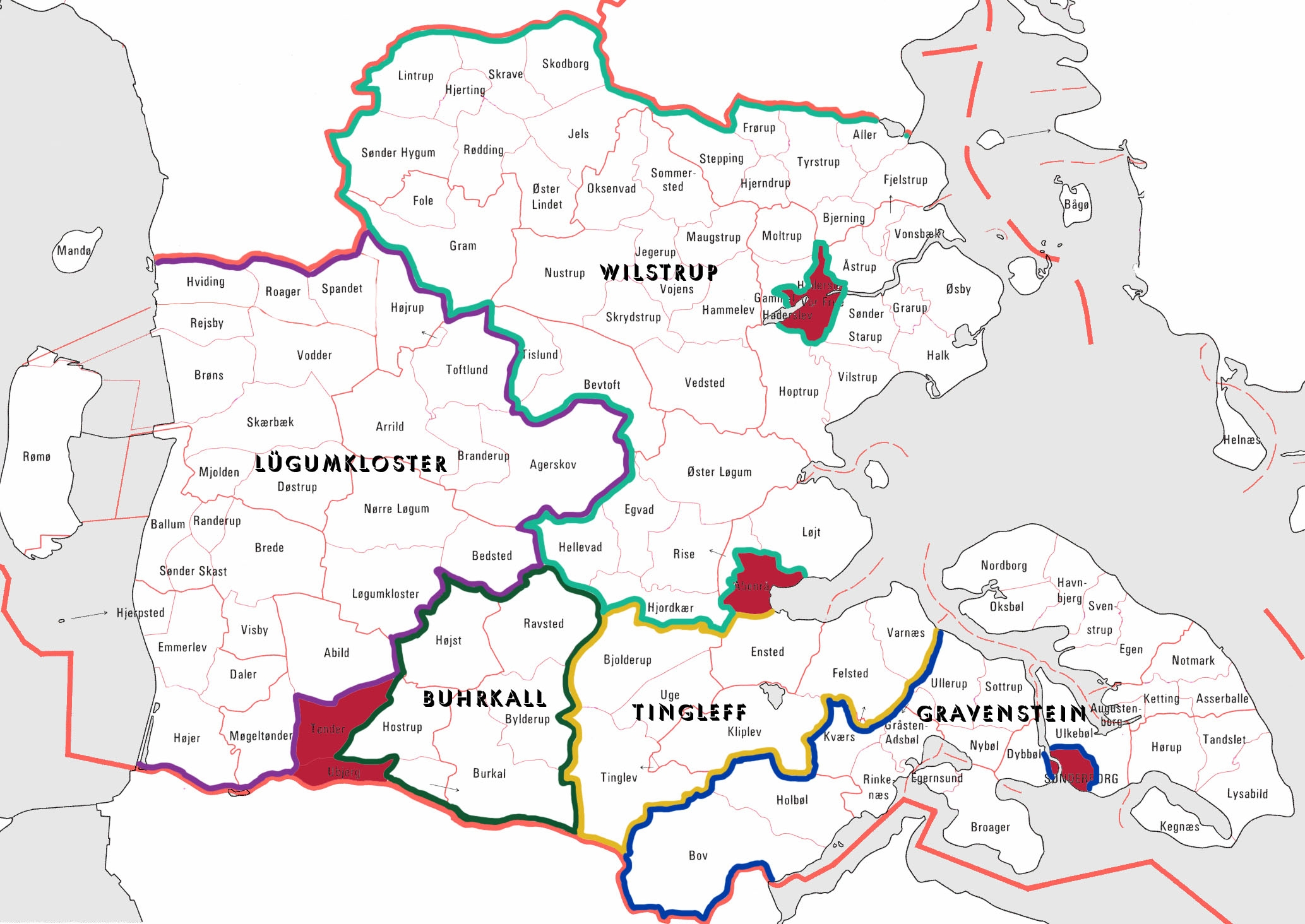 Karte mit den Pfarrbezirken der Nordschleswigschen Gemeinde.